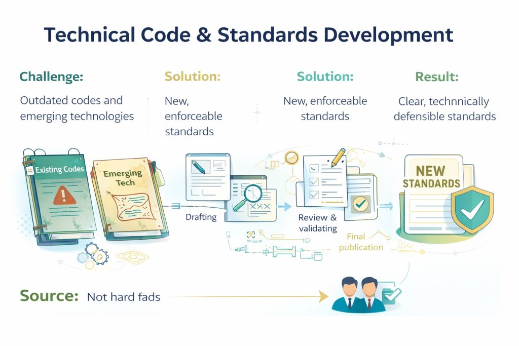 Full-cycle standards development from initial gap analysis and research through drafting, stakeholder review, technical validation, and final publication. TCHECO manages the entire process, ensuring that the resulting code is both technically rigorous and practically implementable.
